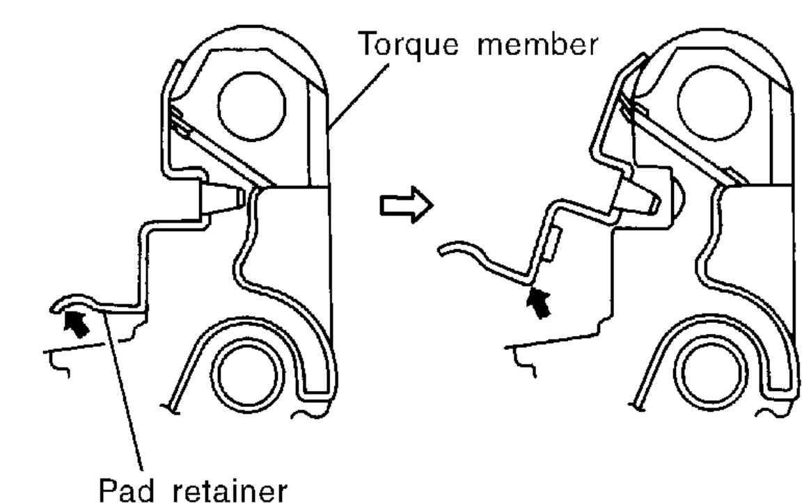 When removing the brake pad retainers from the torque member, lift it in the direction indicated by the arrow as shown so that it does not deform.