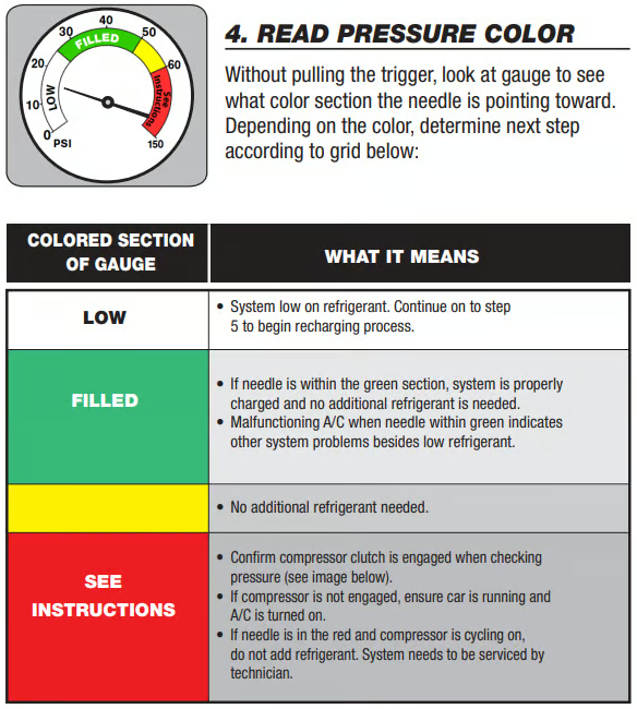 I don't know what these numbers mean, but I went to the auto parts store to use one of those A/C charges with the gauge. - I believe it was this one - Arctic Freeze R-134a Refrigerant Kit: Includes Hose with Gauge, Seals and Delivers Colder Air, 18 oz, CA Compliant - When using this, it pointed to "Yellow."