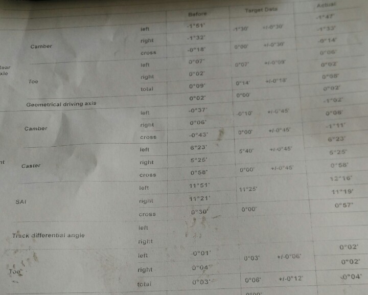 I'm not sure on your printout, (thank you for including that), but from what I can see, it looks like rear thrust angle isn't excessive. I had two trucks years ago that pulled to the right. Both had camber and caster that were perfect and not easily adjustable. The only thing I could find was a slight rear thrust angle with both wheels turned slightly to the right. I ground on the leaf spring spacers to allow me to move the left side of the axle back a little. That was enough to eliminate the pull. These were rear-wheel-drive trucks and the thrust angle apparently was pulling the entire truck to the right. I've had other similar trucks with worse thrust angle that never had a problem.