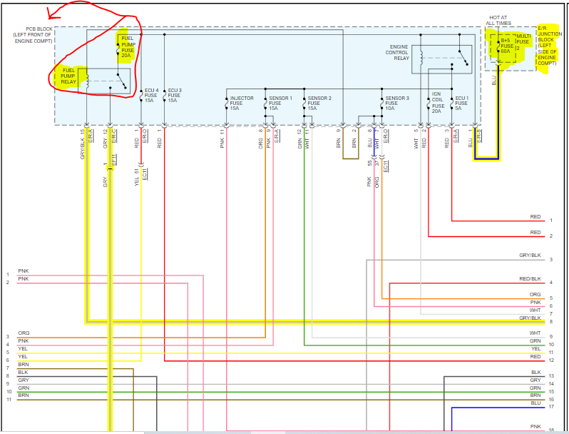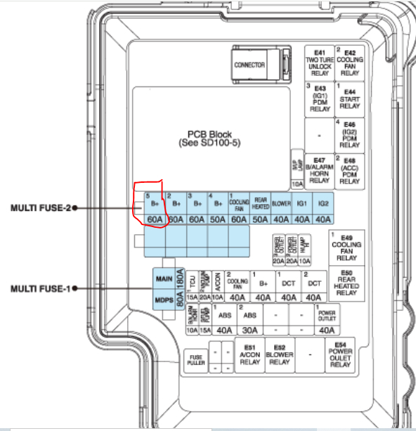 As a result, we need to test a different way. We need to determine if there is power making it to the pump, but before you do that, I want to check fuse B+5 fuse in the engine room junction box. This is a 60-amp fuse that supplies the PCB with power. If you look at pic 3 below, I attached a pic of the under-hood fuse box and circled the B+5 fuse.
