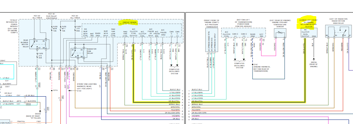 The A/C compressor on this vehicle receives power from the totally integrated power module (TIPM). I attached a pic below of the schematic and highlighted the related wiring.