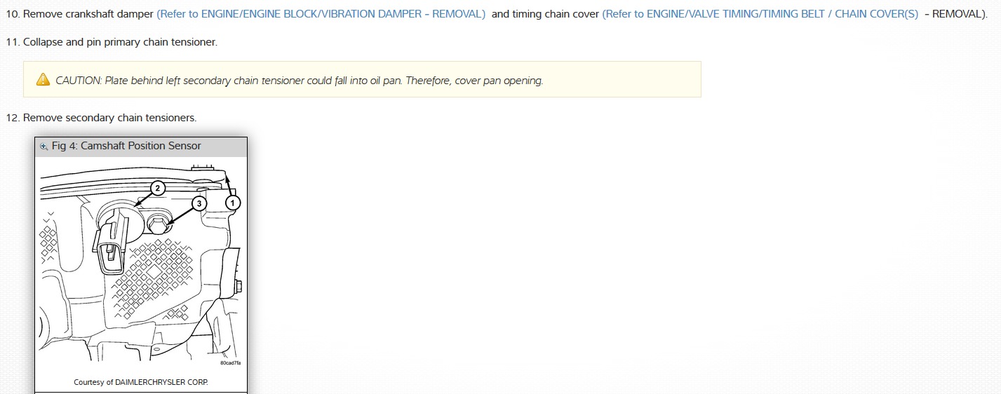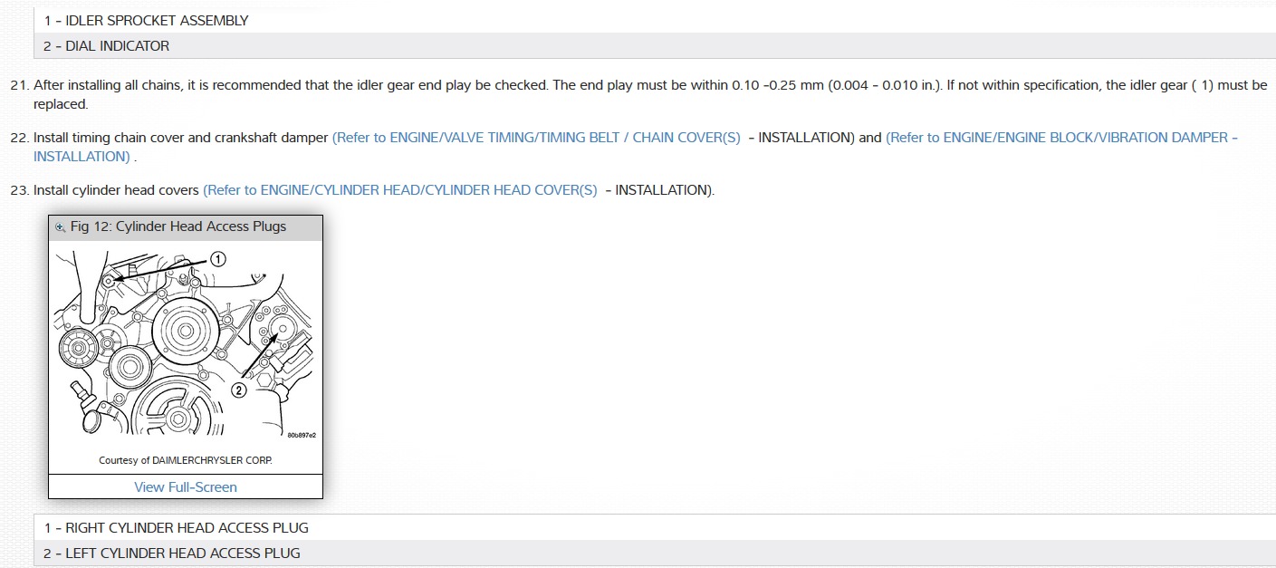 This is a well taken care if Jeep where I am an aircraft mechanic, wifes car, driven 110-120 miles a day on highway changing oil and filter aproximately at 4500 - 5000 miles and balance rotate every second oil change. Transmission filters changed etc and all the simple at conclusion electrical problems fixed by me. Good vehicle with the Mercedes tranny. Made own tranny dipstick. 259,000 miles. Even got 103,000 miles on Michelin MXV4 Primacy tires. Started hearing on cold mornings it take a few seconds for the cam chain tensioners to pressurize, and chain running against tensioner arms, but then quiets in just a few seconds. Just got home from a month long trip with wife continuous use. Heard the car today where I started it and after a few seconds the sound did not go away. So I don't really have time for this now but I believe it is time to change as I squirted WD-40 on the belt idler pulleys and sound did not change. I have read on Jeep forums but found nothing on changing these on this engine. I have read tonight around the net that the tensioner pistons being replaced twice once from parts on ebay and the. From discount house and both pistons bad shortly. So guess need to go with OEM tensioner pistons whoch are 60 it seems piece. Discout house 400 w/out gears. But I have no torques or guidance or even know if gaskets come with kits and I bet I will need to take rocker covers off and if that so I bet intake. I have only till Monday and this is Thursday night. No other vehicles for her to use and I need to go back oto work for another 18 days on the 28Jan which is a week away and she has no other boyfriend to help. Guidance? Manual pdf's?