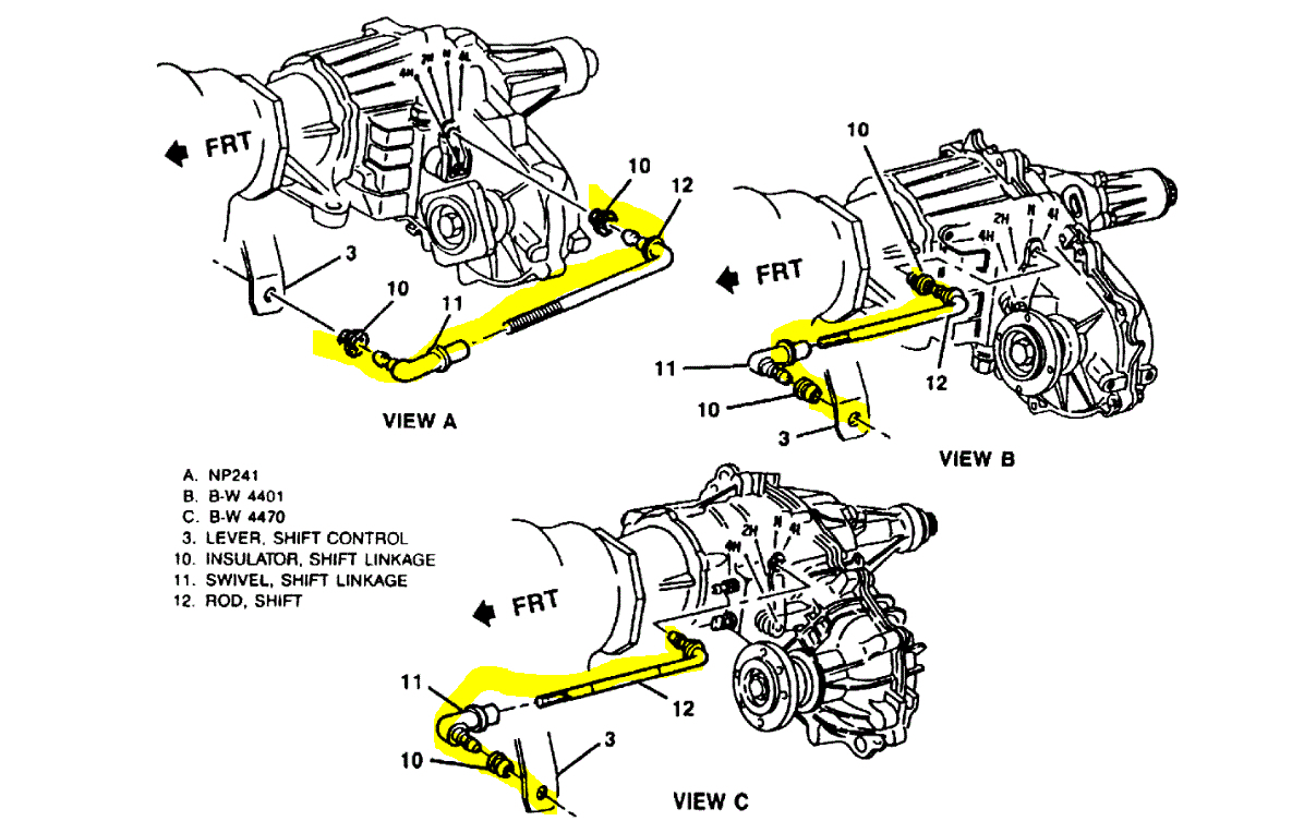 The first thing I suggest checking is the shift linkage under the vehicle. It is a steel bar/linkage that runs between the 4wd shifter and the transfer case. See pic 1 Make sure nothing is loose, damaged, and so on. It isn't uncommon for the plastic grommets to fall out or wear out, so check them as well.