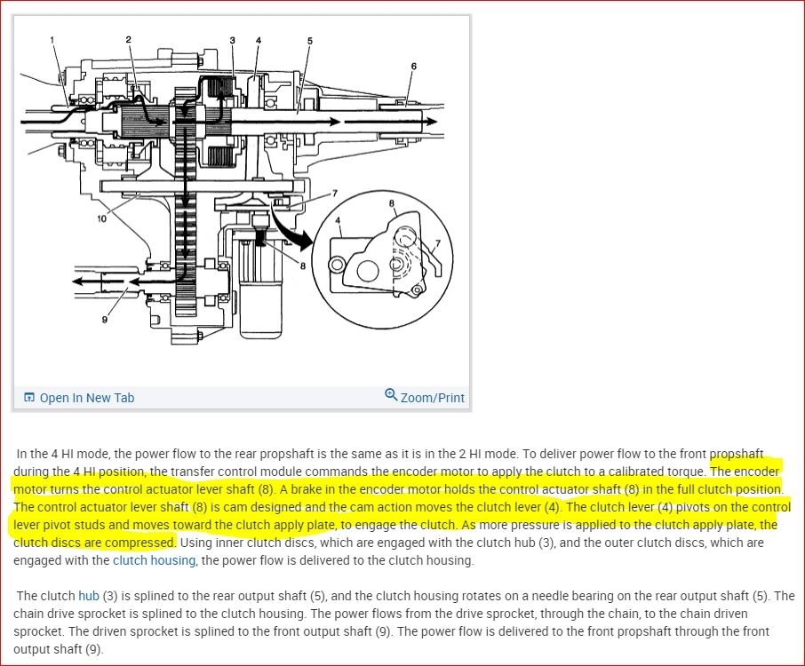 I attached the description of your transfer case. If it is not engaging then I would expect the clicking is coming from the encoder motor trying to turn the actuator but it is not able to. So it is either the motor or this assembly. The best way to figure it out is get in there and monitor the operation. I included the procedure for replacing the encoder actuator which will get you into the entire system.