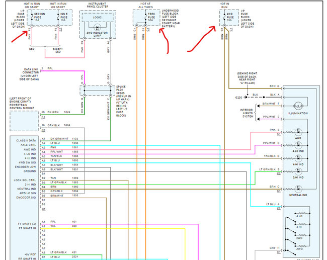 Push the 4-wheel drive button to engage; it blinks like 5 times and stops blinking. Checked the PJ to the Transfer Case Shift Motor. There is ground at the center wire, and 5VDC at the orange wire. Wish I had a schematic for the system. A new transfer case shift motor gives the same result. What is pulling the 12VDC down to 5VDC?