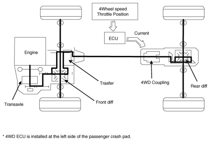 Our reference does not list a 1.9L engine in the Hyundai Santa Fe. The smallest is a 2.4L. You have an all wheel drive system that can be in either Auto or Lock. In Auto Mode the system will automatically send torque to all four wheel when it senses that the rear wheels are slipping. In Lock Mode, torque goes to all four wheels. If you go above about 30 MPH, it switches back to 2WD automatically to prevent damage to the system. I have attached a couple images that can help you visualize this.