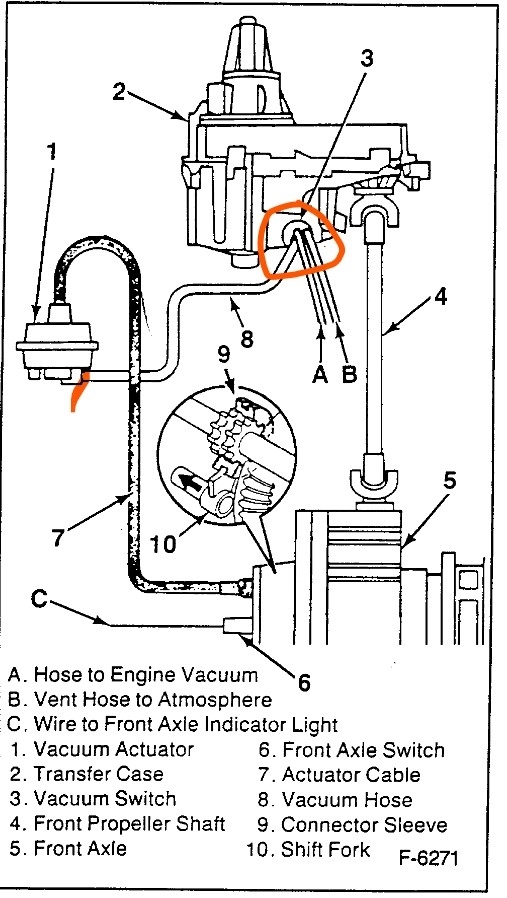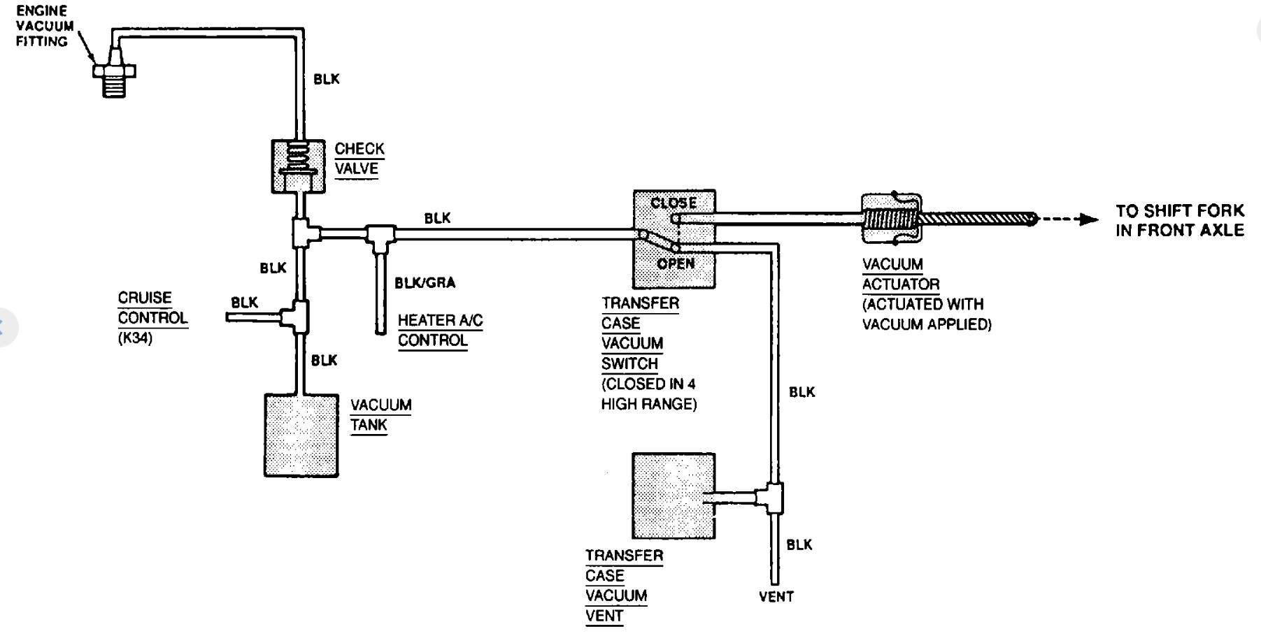 The easiest way to work on these is to work backwards. Take a handheld vacuum pump and connect it to the actuator. Apply vacuum and then verify the axle is engaged - the 4wd light on the dash should light and if you shift into 4wd and then turn sharper on pavement. It should bind up and crow hop? Yes= axle is engaging, and transfer case is operational. That rules out the case and axle disconnect and the actuator and cable. Next - use the gauge on the pump to test for vacuum at the line on the actuator. With it in 4wd and the engine idling there should be a strong vacuum there. I'm thinking it will be weak or not there. The next stop would be the vacuum switch on top of the transfer case. It has 3 lines to it, one goes to the actuator, one goes to the engine vacuum source and the other is a vent. In 2WD the switch vents the actuator to atmosphere to unlock the front axle. In either 4wd mode it sends vacuum to the actuator. I've replaced a lot of them because they fail. However, you want to check the vacuum source line first. It runs from the intake down the rear of the engine and those lines don't age very well, they split or crack and now the 4WD doesn't work. So, check that line for vacuum, you can reach up and pull the 3-way vacuum connector off from under the truck. It's right above the spot the T-Case shift lever or motor is located. Generally, if I've got this issue, I just get the actuator as they fail so often that even if it isn't the current failure, it soon will be. GM part # 89059420. On that 3 port connector, if you have someone start the truck you should hear and be able to test the vacuum to the selector. Now there have been a few 98 Blazers built that had the later system adapted to them. That version just puts a solenoid valve in the line between the actuator and the selector on the transfer case. It's easy to find because 99% of them are within about 10 inches of the actuator stuck to the inner fender or tied to the harness. Those can stick closed. The system works okay, but I had enough of issues with the ones I had that I opted to convert them to a manual cable that I could pull inside. The advantage of that was that I could have a low range function in 2WD. Not something for everyone but there are times it was handy.