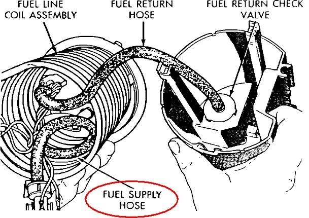 An even less-common cause is a dry-rotted fuel supply hose in the fuel pump housing in the tank. That's shown in the second drawing. This one is affected by fuel level. Air can be drawn in through the hose once fuel level gets down to that point. Unlike with the strainer, the engine will not run okay after sitting for a few minutes. The best clue here is the fuel pressure will drop off very quickly once the engine is stopped. Normally it should hold for days or weeks. The leak is inside the tank, so you won't see or smell any gas leaking outside.