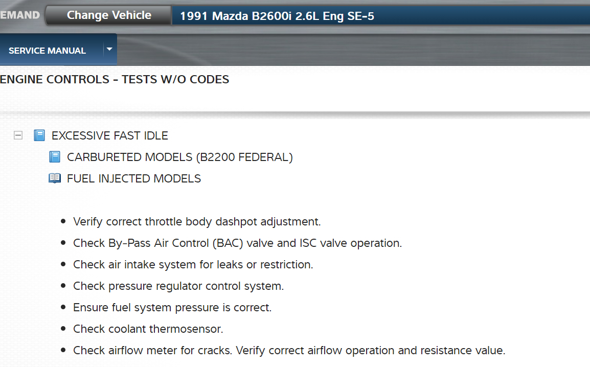 I have a 1,300 page mechanics repair manual for a 1992 b2600i and I have been going through it. I haven't checked the circuit board down near the feet of the passenger side (as I just found out about it a moment ago on this site) but I have checked for water in the fuel line, fuel filter, fuel pressure, every sensor that has anything to do with the control system and they all seem to be good. I pretty much determined it's the wiring harness under the intake manifold, which I'm not sure of because I do not understand how that can go bad.