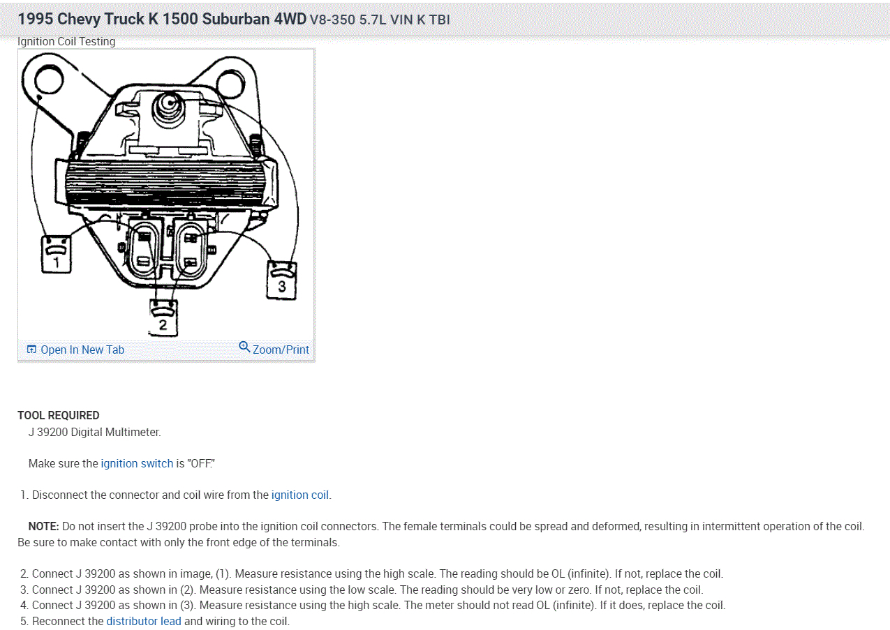 The first thing we need to check is the ignition coil (in the distributor). I attached the directions below for testing. Here is a link that you may find helpful: