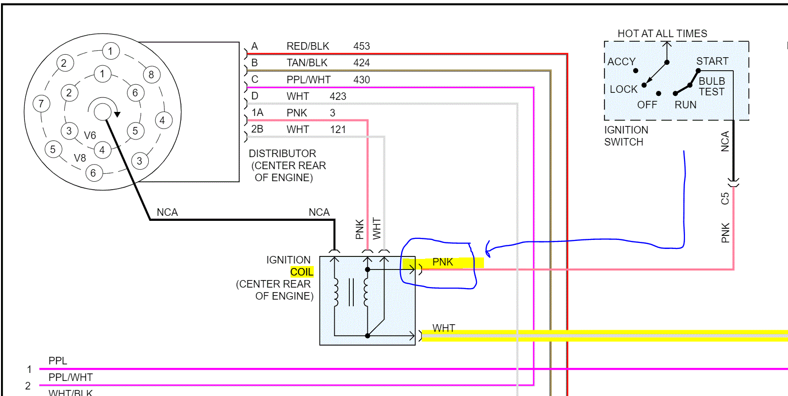 If the coil checks good, then locate the pink wire at the distributor connector. Disconnect the connector, turn the key to run, and confirm there is power to the coil. See pic 2