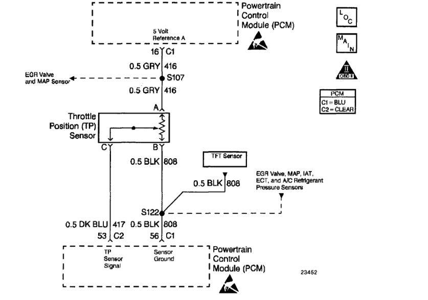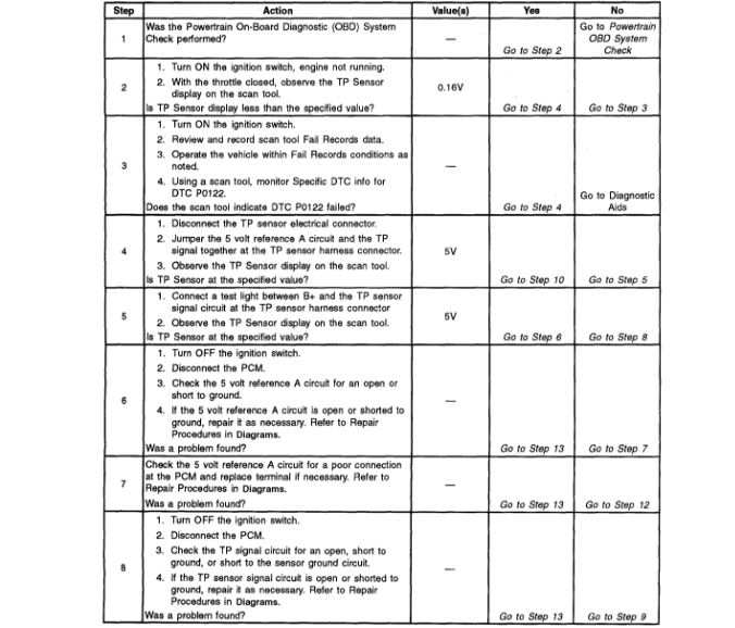 The Throttle Position (TP) sensor circuit provides a voltage signal that changes relative to throttle blade angle. The signal voltage will vary from less than 1 volt at closed throttle to about 4 volts at Wide Open Throttle (WOT). The TP signal is one of the most important inputs used by the Powertrain Control Module (PCM) for fuel control and most of the PCM-controlled outputs. The PCM monitors throttle position and compares actual throttle position from the TP sensor to a predicted TP value calculated from engine speed. If the PCM detects an excessively low TP sensor signal voltage, DTC P0122 will be set.