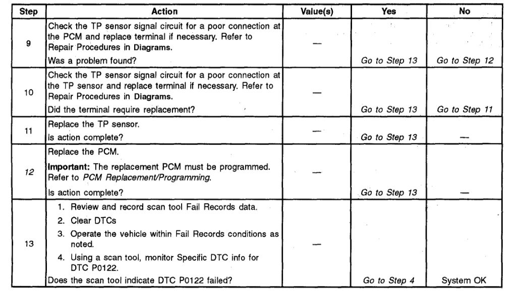 If DTC P0122 cannot be duplicated, the information included in the Fail Records data can be useful in determining vehicle mileage since the DTC was last set. If it is determined that the DTC occurs intermittently, performing DTC P1122 Diagnosis may isolate the cause of the fault.