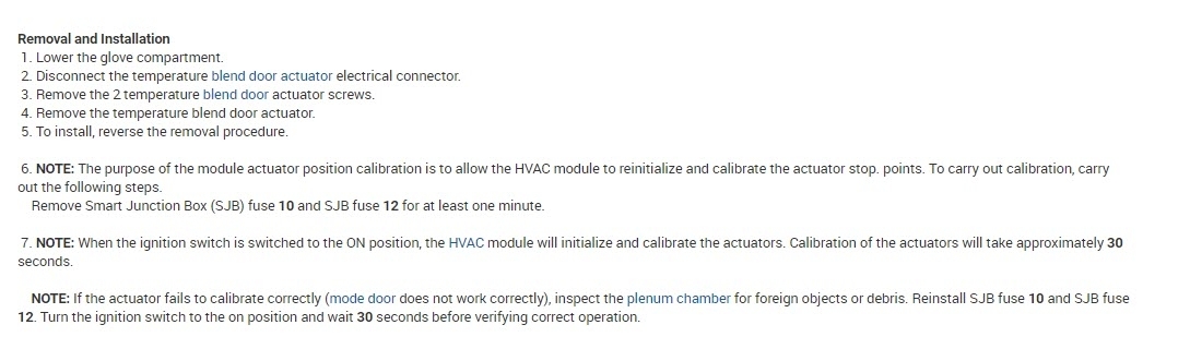 NOTE: If the actuator fails to calibrate correctly (mode door does not work correctly), inspect the plenum chamber for foreign objects or debris. Reinstall SJB fuse 10 and SJB fuse 12. Turn the ignition switch to the on position and wait 30 seconds before verifying correct operation.