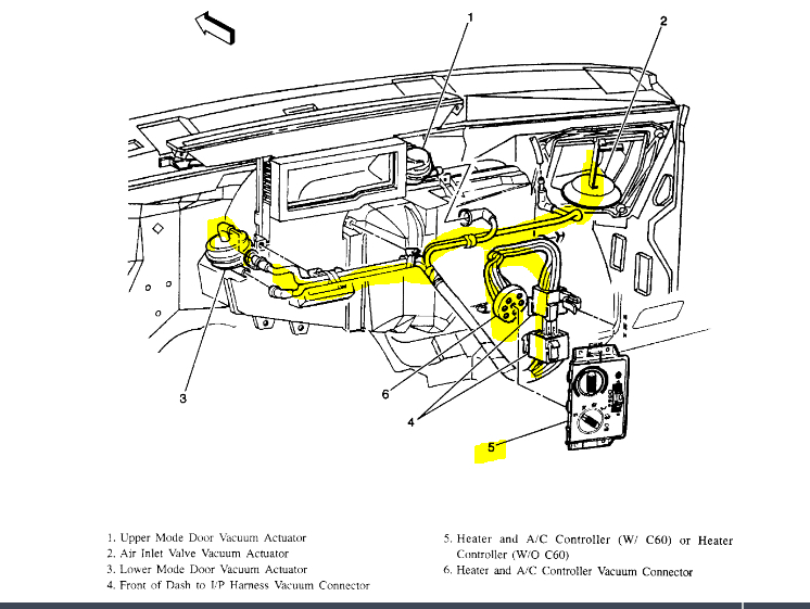 You know, the more I think about it, the more I suspect we have a vacuum issue. I attached a pic below showing the vacuum schematic. At the bottom of the pic is a legend. Anything listed as Mode deals with airflow direction. Do me a favor. Start the engine and listen to see if you hear a hissing sound under the dash near the controller.