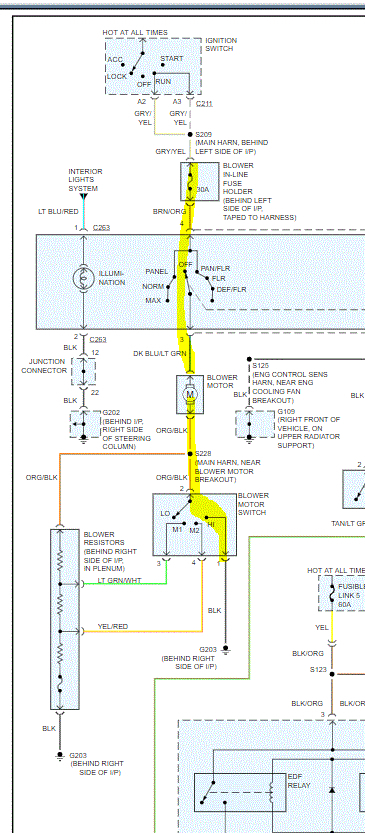 Let me know if this makes sense. LOL You could also check for power to the yellow/red wire and the light green/white wire. When the switch is in the low speed setting, the green/white wire should have power. On medium speed, the yellow/red wire should have power.