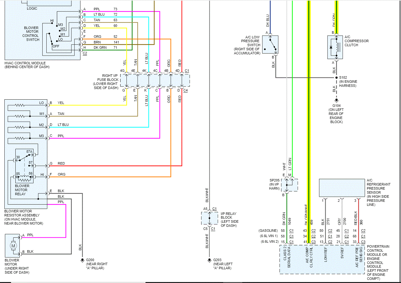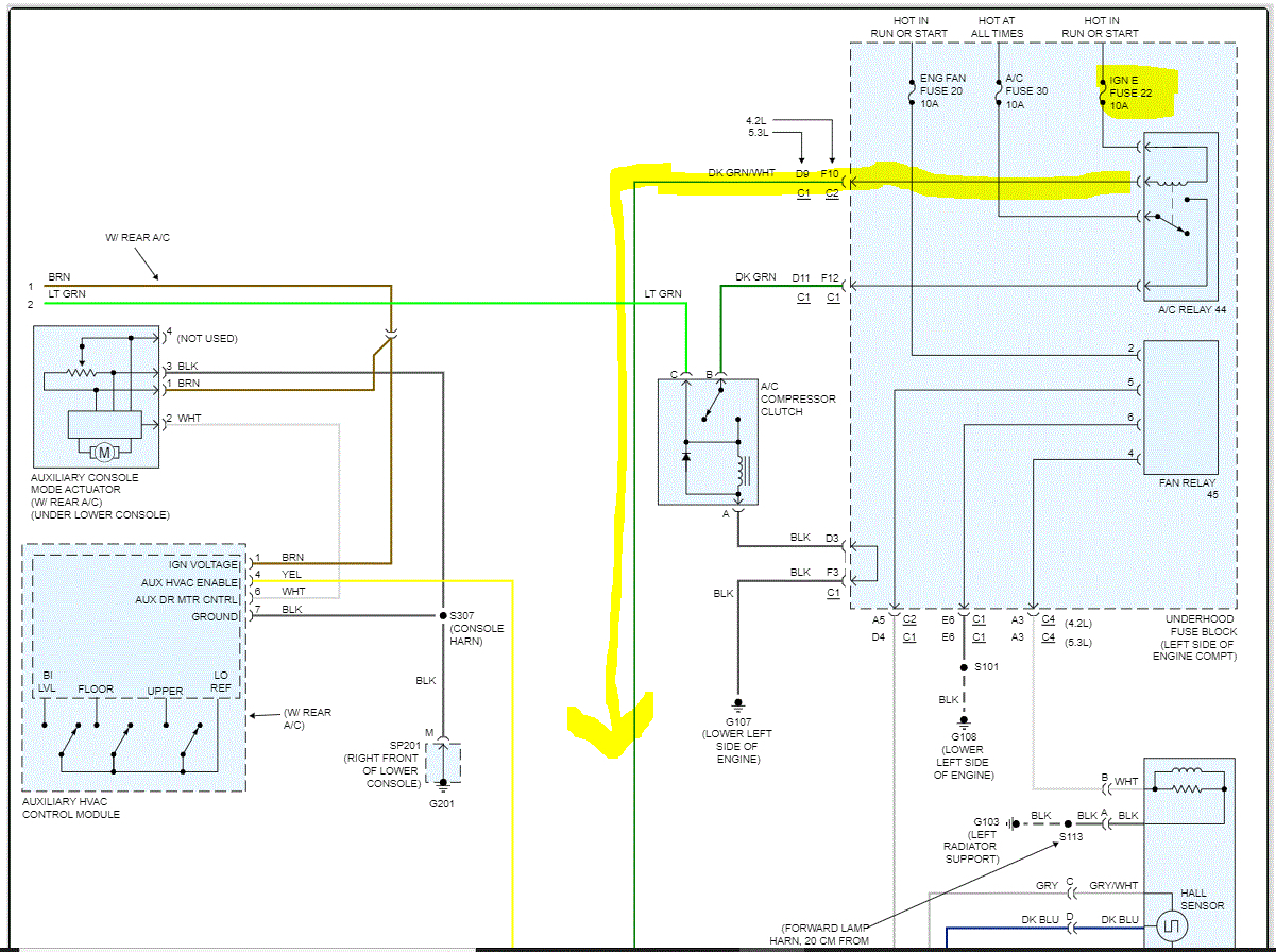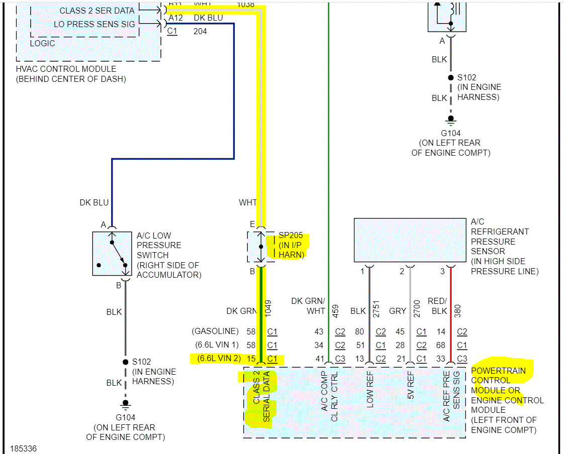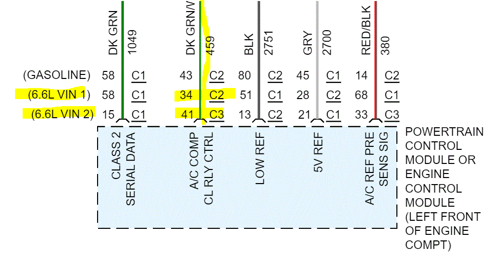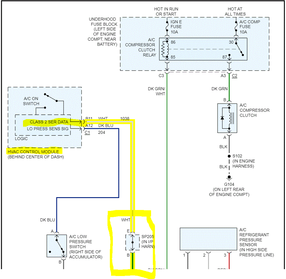 See pics below Note: There is a splice in the serial data line which changes the wire from white to dark green. If the splice has failed, that will prevent the PCM from providing a ground path to the compressor relay. I added the last pic late. It explains where the splice is located.