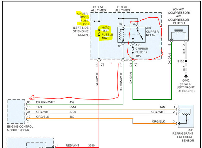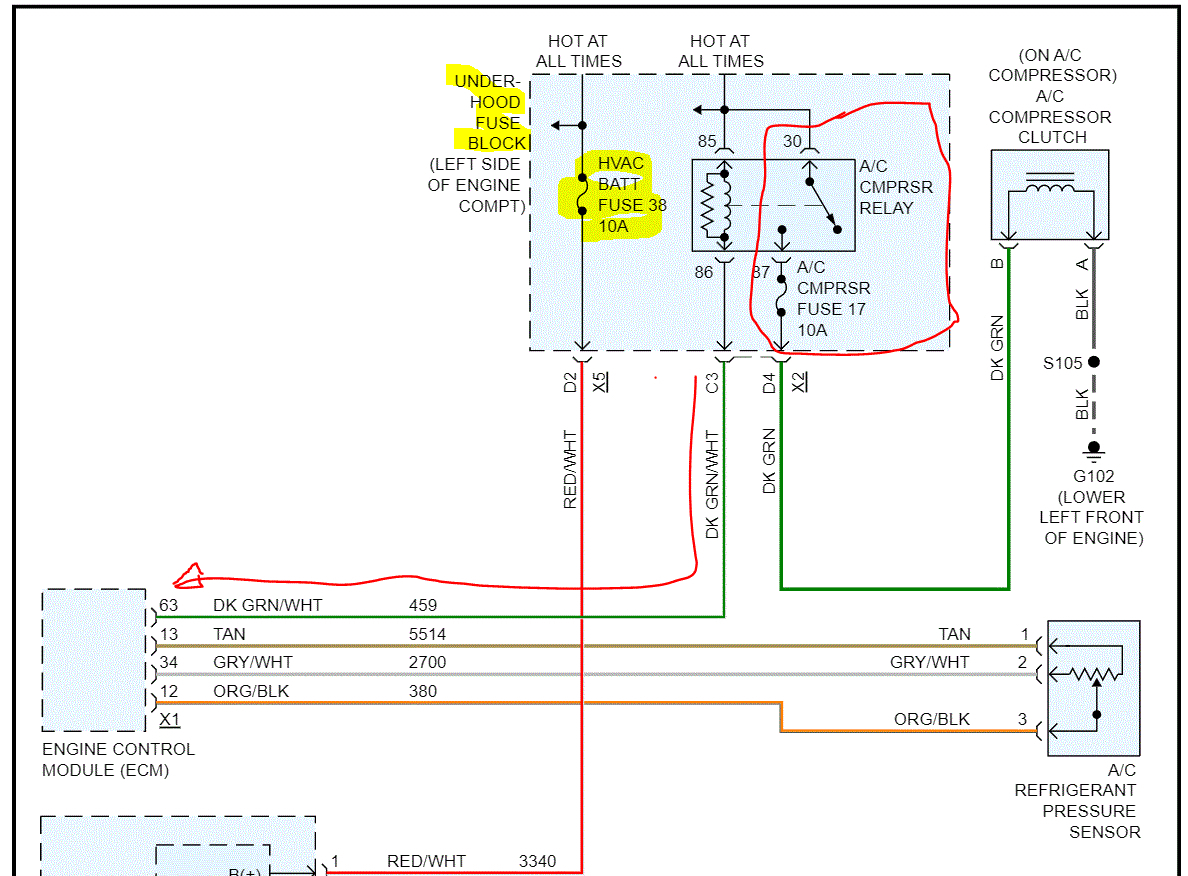 If it is good, we need to check the relay itself. We know the compressor fuse is good because it is located after the relay, and you are able to jump it from the relay.