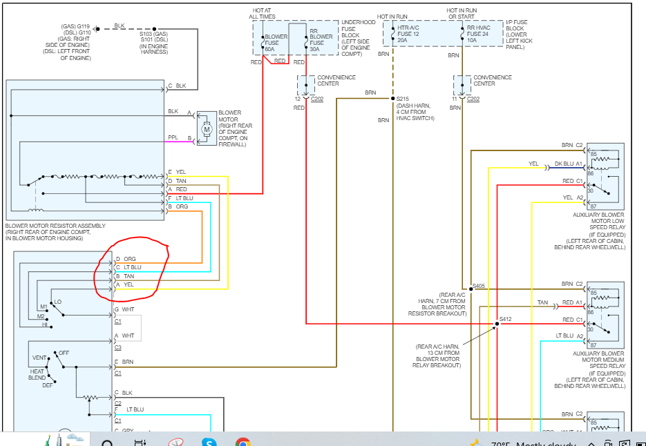 Since it works on the two highest settings, I know a ground path is being provided for the orange wire and the light blue one. So, we need to identify the tan wire and the yellow wires at the switch. Disconnect the connector and check for continuity to ground when you test those two pins.