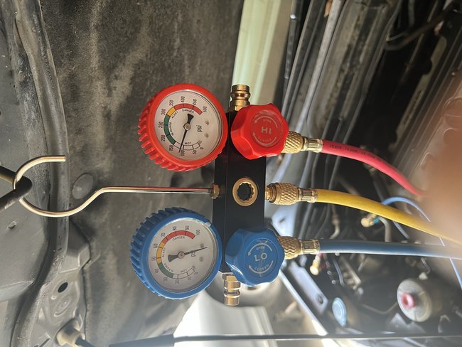 Attached is a picture of the manifold reading. The compressor clutch engages, but still the air is not cold. I put my hand on the low-pressure line and it is not cold. I replaced the receiver/drier and the expansion valve. I flushed the lines and the evaporator as well. After doing some searches online, several websites state if the low side is high and the high side is low, it's possible the compressor is bad. I need to know definitely before I go out and buy a compressor because the clutch engages after adding Freon in the system.