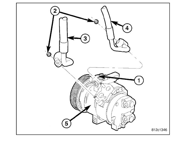 7. Disconnect the suction and discharge lines from the A/C compressor and remove and discard the dual plane seals.