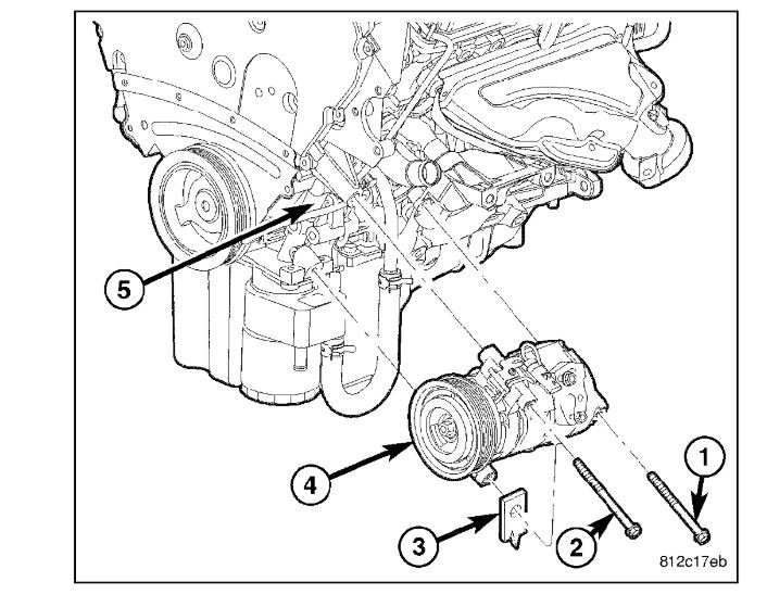 11. Support the A/C compressor (4) and remove the bolts (1 and 2) that secure the compressor and automatic transmission cooler line bracket (3) to the cylinder block (5).
