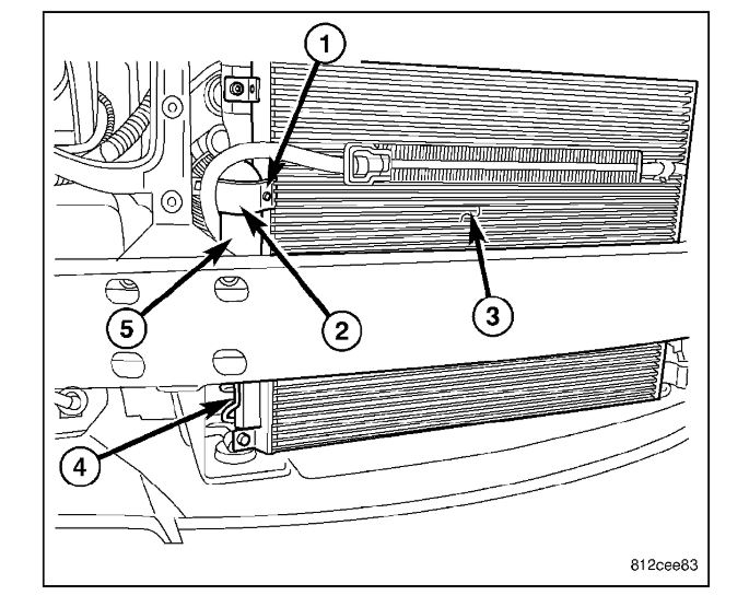 5. Remove the bolt (4) that secures the receiver/drier (5) to the A/C condenser.