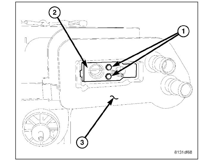 9. Remove the two bolts (1) that secure the A/C expansion valve (2) to the evaporator tube tapping block located within the foam seal (3).