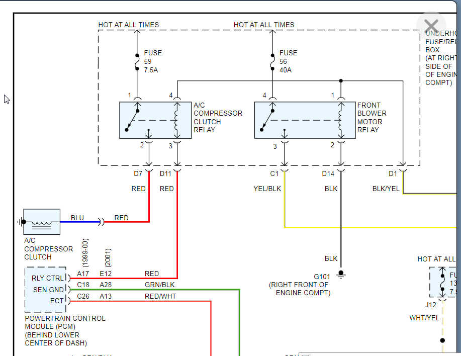I attached the wiring diagram. Can you remove the relay and turn the engine on and A/C on and measure voltage on pin 4? Then you need to check and see if the PCM is grounding the relay on pin 3. You do this by checking for ground when the AC is on. Put the red lead of your meter on the positive battery terminal and then put the black lead on pin 3 of the relay. With the AC on you should have 12 volts on your meter.