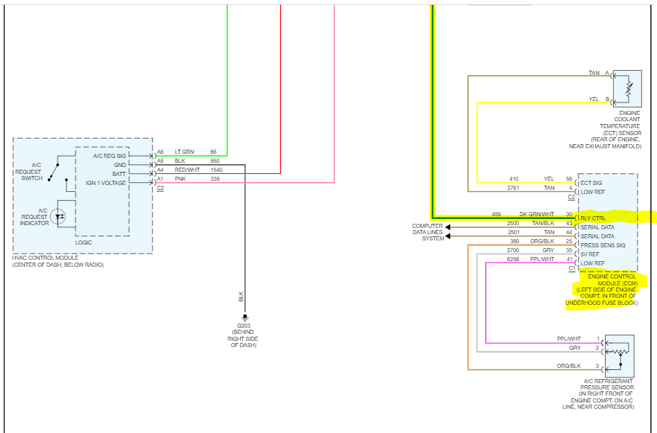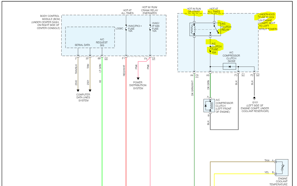 I attached the wiring schematic below of the A/C clutch circuit so that you have a reference.