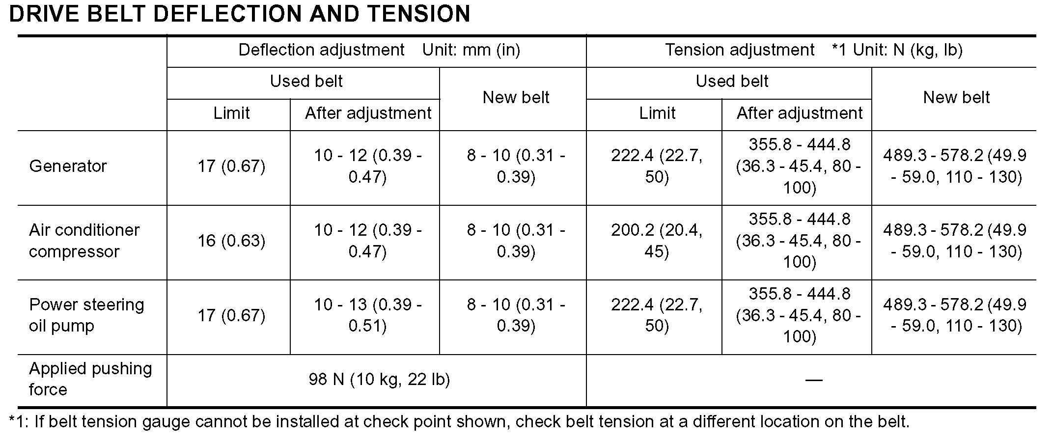 Adjust if belt deflection exceeds the limit or if belt tension is not within specifications.
