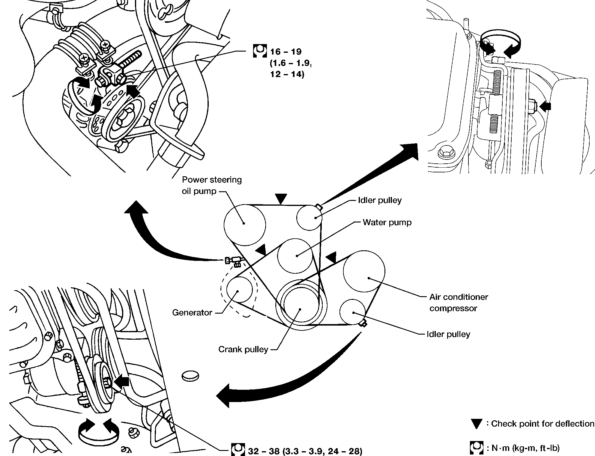 2. Inspect drive belt deflection or tension at a point on the belt midway between pulleys.