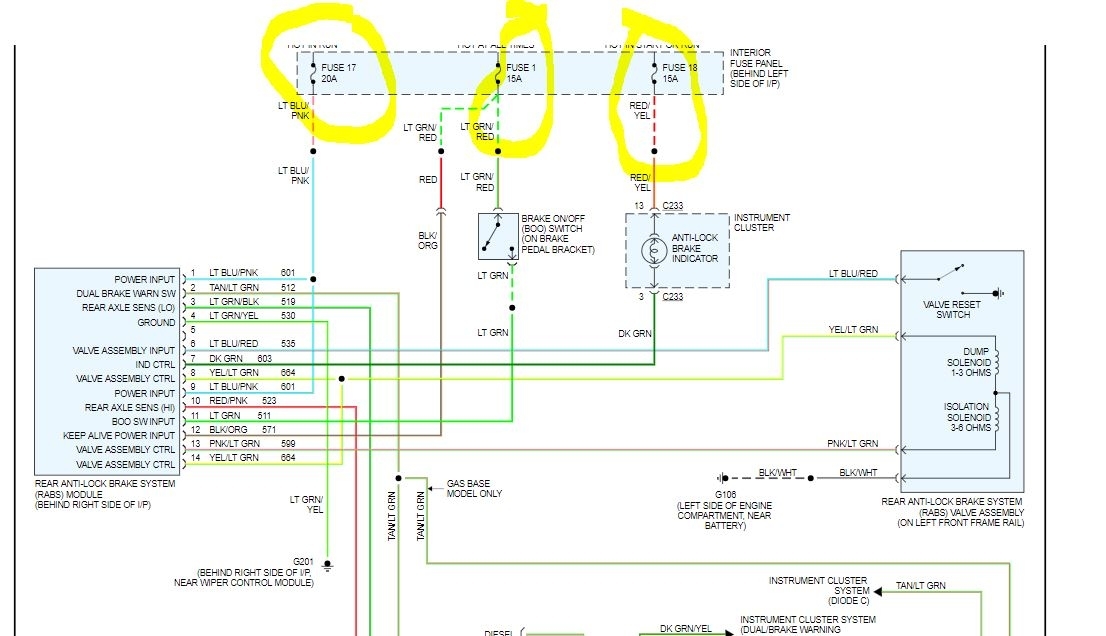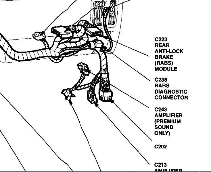 NOTE: Verify the ignition switch is in the RUN position (engine does not need to be running). Next, locate the black RABS II diagnostic connector. The diagnostic connector has two mating halves (one of which has a black/orange wire connected to it). Disconnect the two halves.