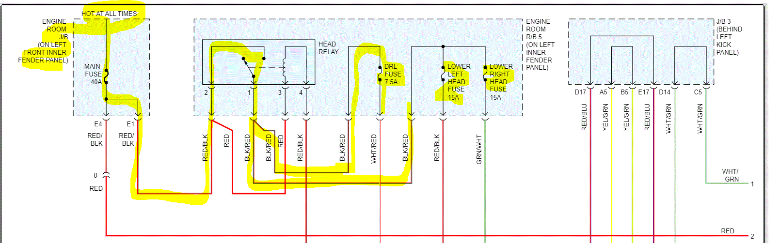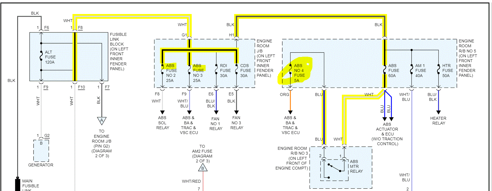 Looking through the schematics, I noticed all fuses (which jump around as far as the wiring) are powered via a white wire or a black wire from the fusible link box.