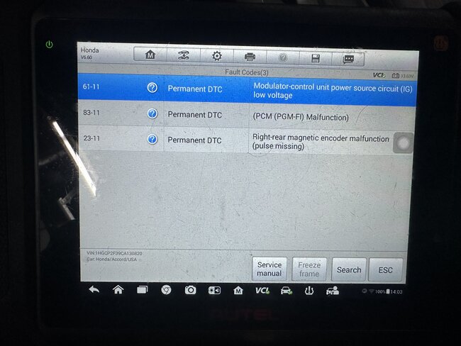 So you have codes: So I would replace the left front wheel speed sensor, then use your scanner and clear the codes. The first to codes are because the battery was low.