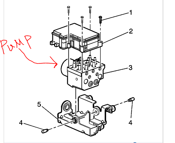 The ABS pump is integral to the modulator. There are two wires, as mentioned above, that make it work. One is a constant ground. The power supply is controlled by the ECBM.