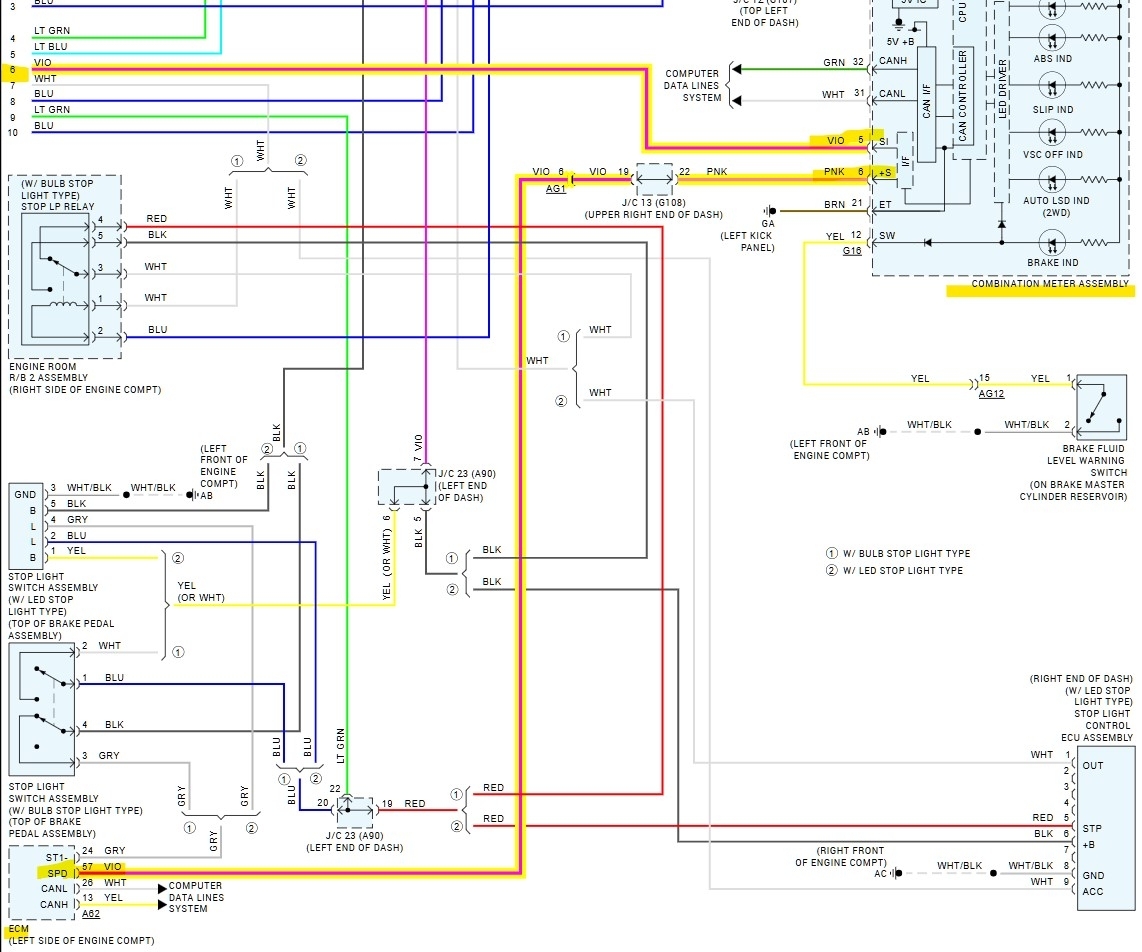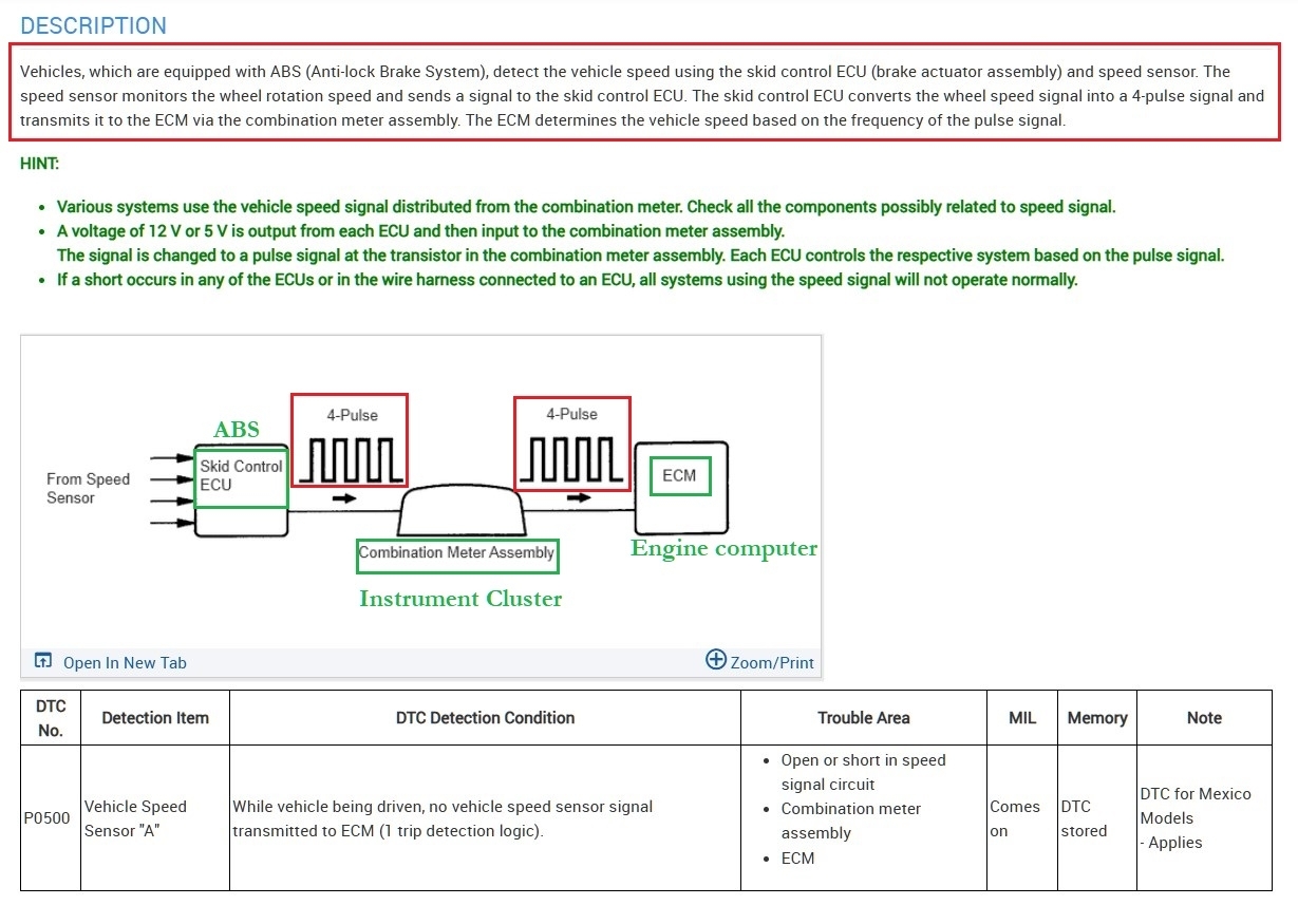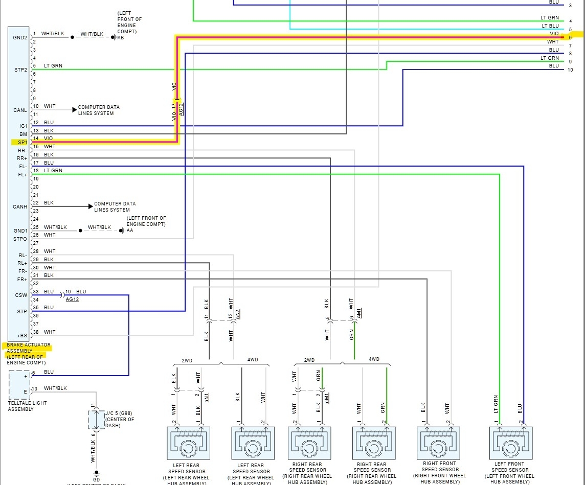 The wiring diagrams shown here (6, 7) show the one wire from the ABS module to the Cluster, then out to the ECM. But I would start with checking any live data if possible. Or we can go right to checking the wire integrity, the instrument cluster is not always the easiest to get to though, some can be quite difficult to get out since the connector is going to be located on the back of the module.