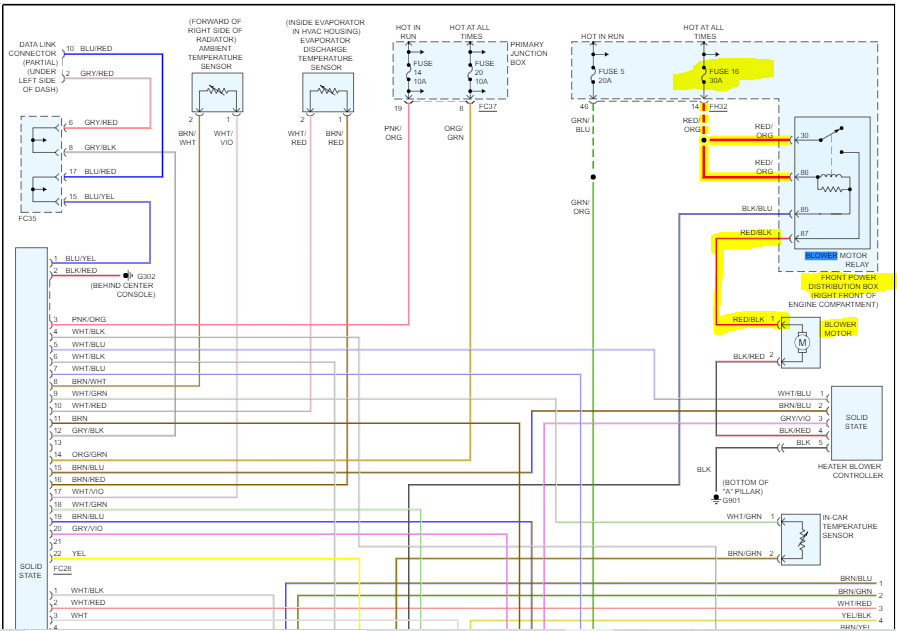 See pics below. Note: The schematic page was cut in half to make it readable for you. I overlapped the two pics so you can follow from one to the next. The last pic shows the fuse to check, and I highlighted the blower motor relay (BMR).