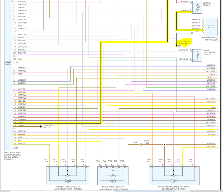 If that checks good, I need you to locate the blower motor under the dash and disconnect the connector to it. There will be a red wire with a black tracer that should have power. Confirm that for me.
