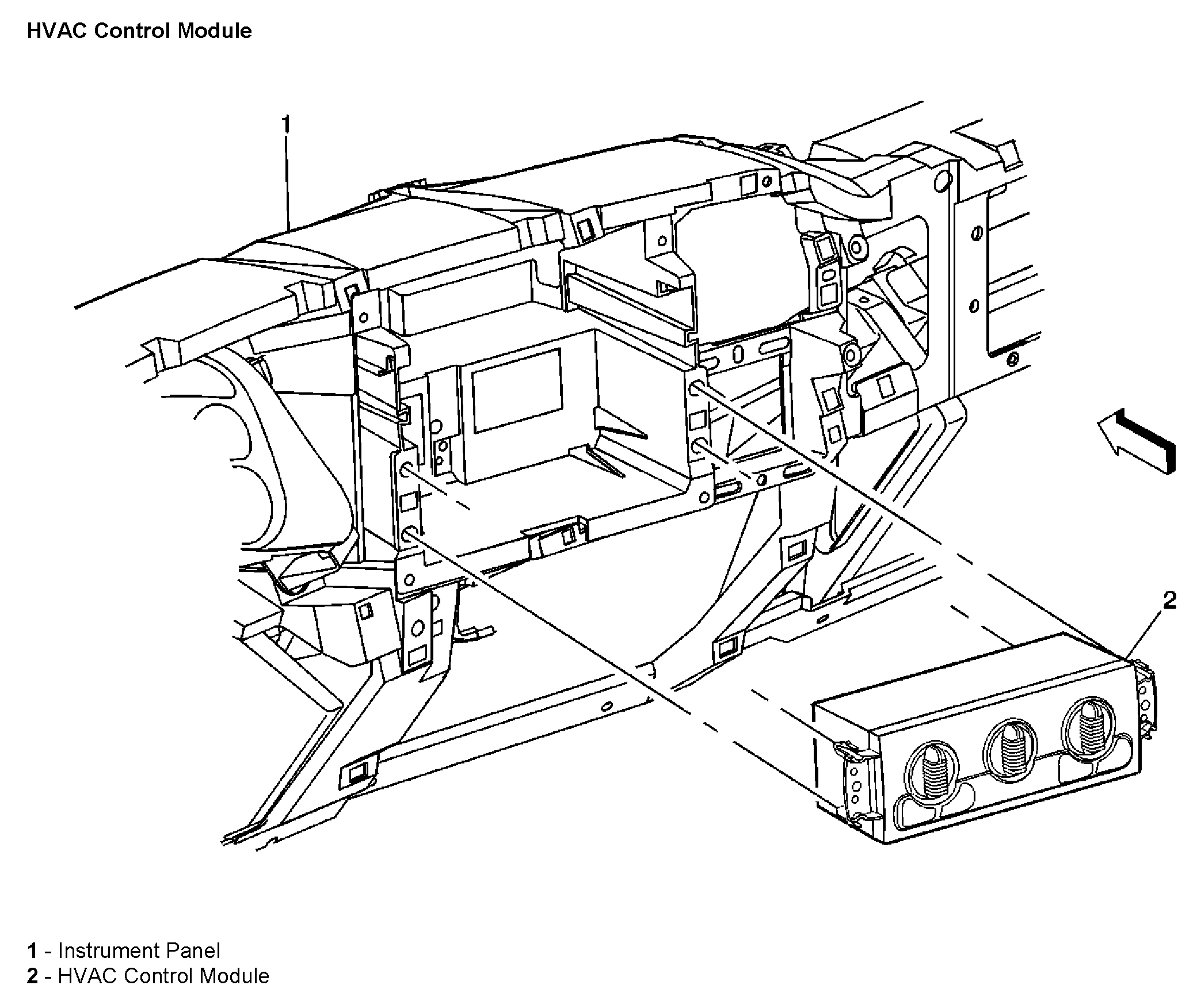 5. Remove the blower motor control processor (2) from the HVAC module (1).