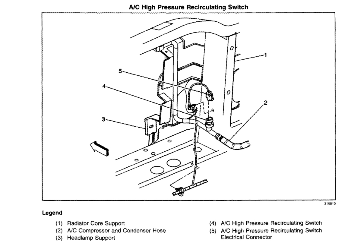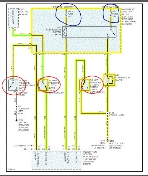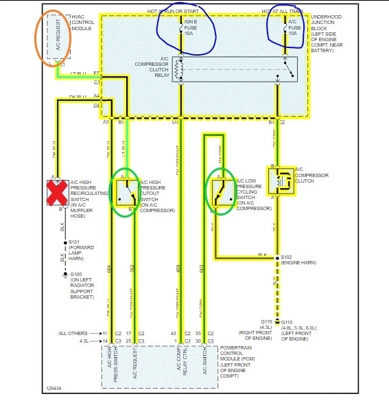 -A/C Low pressure switch(Closes when the pressure is too low) circled in Green