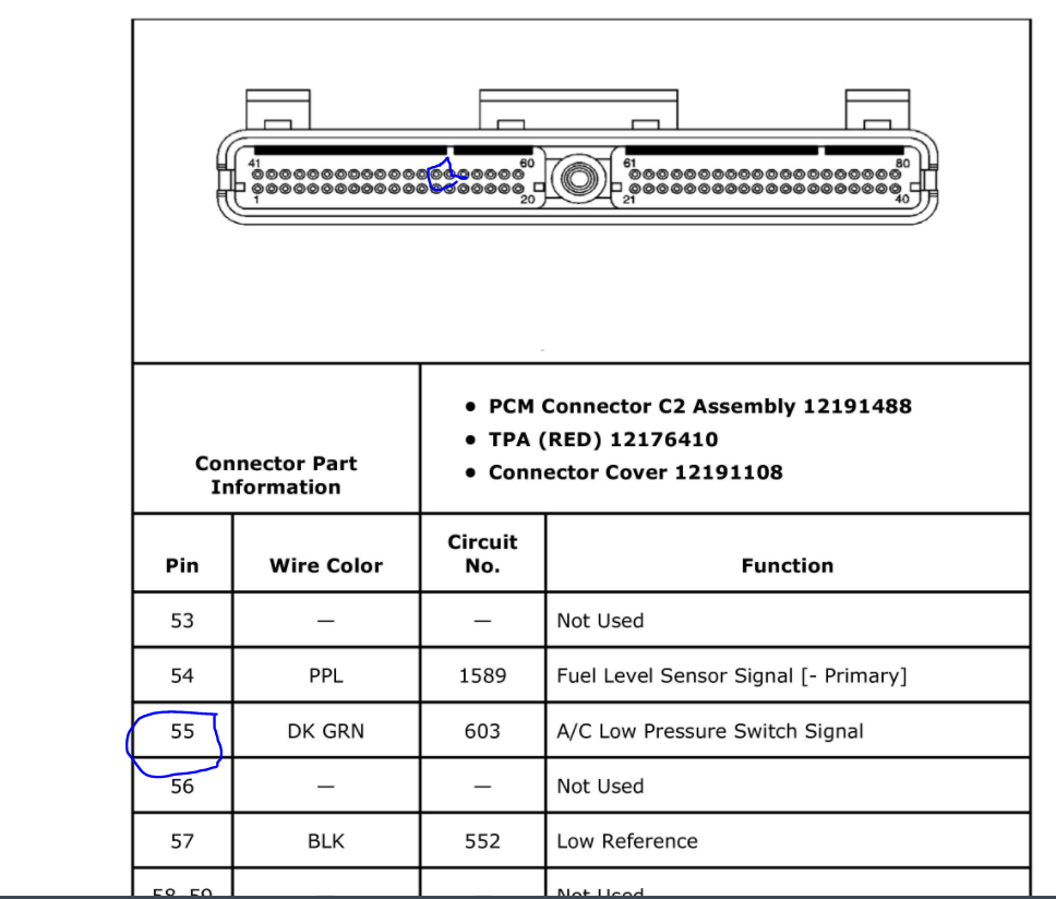 2B. The A/C Low Pressure switch is a grounded circuit that grounds the ECM Red Pin (Please provide Pin ID). The switch will close when the Freon pressures is too Low. Is this correct?