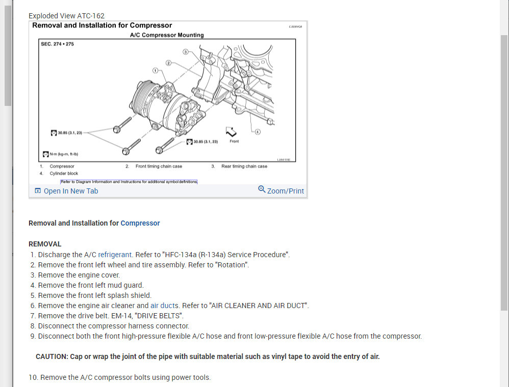 For that you remove the left front tire and then the plastic splash guards from the wheel well. With those off you can see the compressor.
