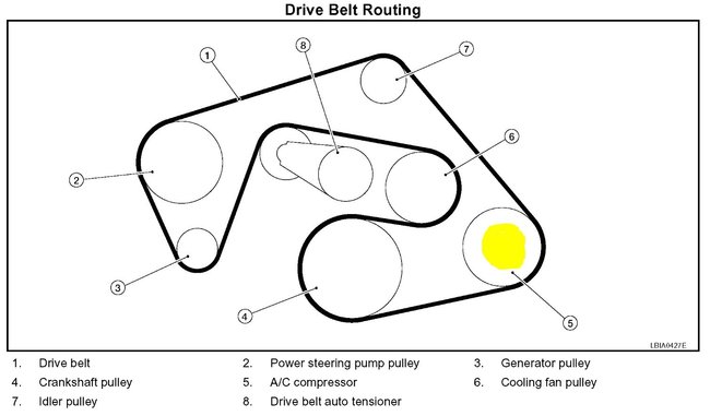 Now you need to remove the air cleaner housing and the duct that connects it to the fender to get room enough to get to the drive belt and compressor mounting bolts. Now that you have room you can remove the AC lines from the compressor and the wiring connectors. Now release the belt tensioner and remove the belt from the engine, if the compressor seized and the pulley doesn't turn you will likely want to replace the belt as it would have been damaged by heat. Then remove the three bolts and the compressor. Replace it by reversing the process, install new O-ring seals on the lines and measure the oil from the old compressor and the new one so you can replace the lost oil. Then bolt it in place and tighten the mounting bolts to 23 ft lb and the lines to 82 inch pounds. Now install the new belt and take it to a shop for a vacuum and recharge. Or just connect the lines up and use it as an idler only. You can get a replacement compressor online for around $300.00 US.