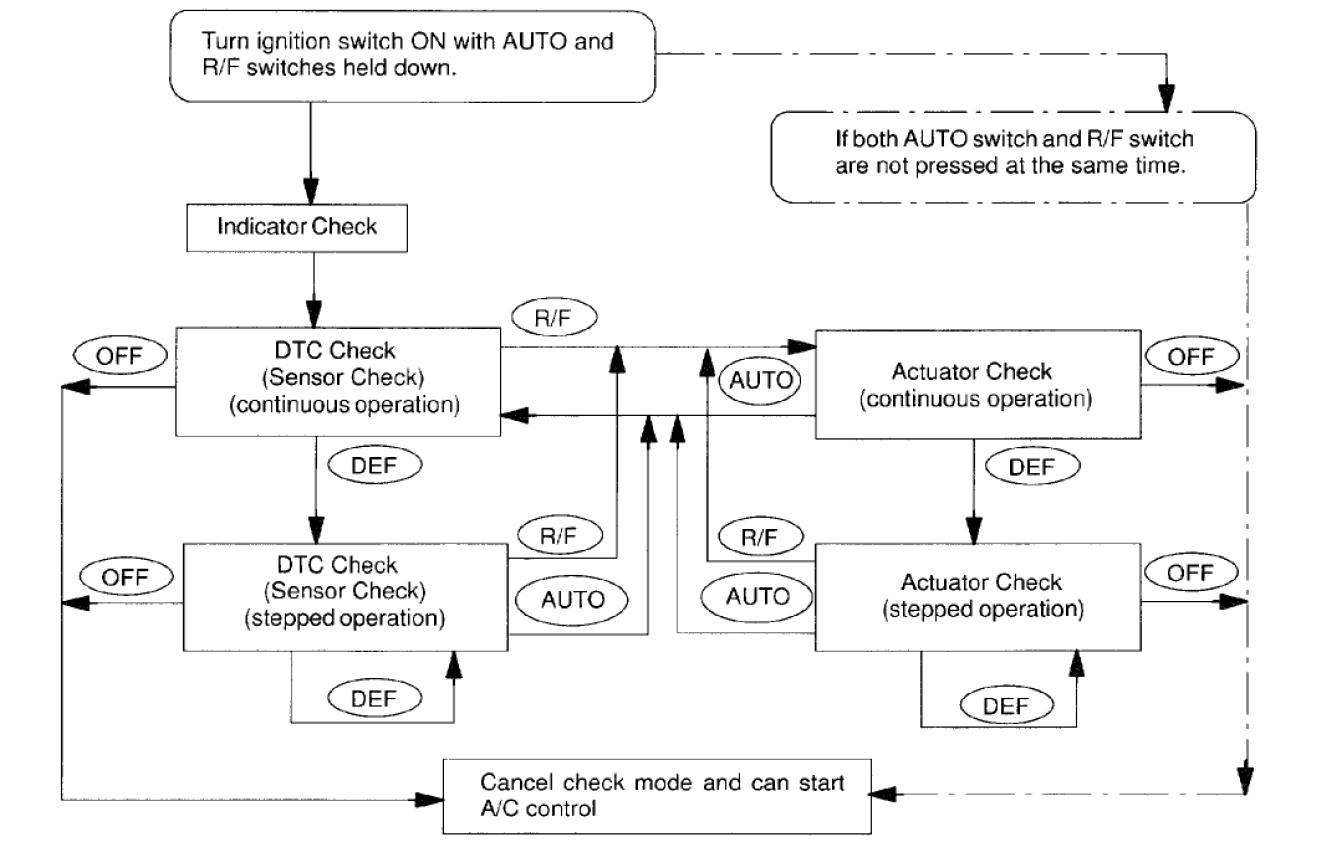 In answer to the R/F question, it is the Recirculate/Fresh Air button. So it is saying, to put the A/C system in diagnostic mode, without ECM test equipment, hold the Auto and that R/F button down concurrently while starting the Sequoia (or Tundra) and, as the flowchart posted above shows, it will put it in DTC mode. The temperature screen will show the Diagnostic Trouble Code, which you can Google or download a service manual to troubleshoot. As to the issue we have, the panel buttons and fan control knob do not respond at all, even when starting. Your finding the sticky rear control button was great! I replaced the relay. The controls still do not respond. I was about to get a new A/C control board until I read your note, Lindsay (albeit a couple years ago so you may not see this, but hopefully it'll help others). I am cleaning the rear sticky buttons now and [fingers crossed]. Thanks! :)