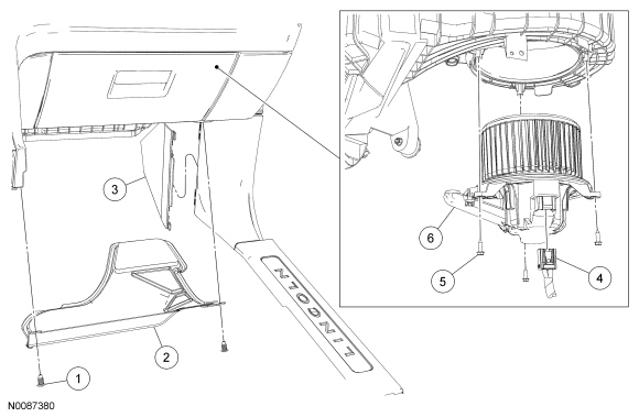 Hello and welcome to 2CarPros. A fan acting that way could be the blower motor itself failing or it could be the controller. The way to test it would be to disconnect the blowers power connection, then put a high draw test light in the circuit. (A headlight bulb or similar works well) Now turn on the system and watch the bulb. If it goes bright then dim then alternates like the fan was doing it is the controller that is failing. If it stays constant and only changes as you change the fan speeds then it is the blower motor itself. Getting to the blower is easy. There are two plastic push pins that secure the cover under the dash on the passenger side. Remove those, then the fuse junction box cover. Then disconnect the wiring and test it. Removing the blower motor isn't hard, there are three screws. Remove those then you need to sort of pry it out of the housing, it can be tricky as there is just barely enough room to get it out. Start by rotating it so the vent tube (6 in pic) is pointing toward the seat, then push on the insulator panel to get clearance.