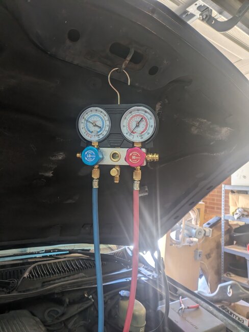 My truck was out of commission with a no crank no start. It took me a few weeks to fix it (thank you Joe). The problem was a broken ground wire to the starter relay. I have been driving it around and the air conditioning isn't working. So, I put my gages on, and I had 20 on the low side and 20 on the high side.