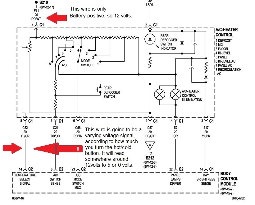 Okay, so with the meter set to DC volts, on 20 volt setting. Set the negative lead to battery ground and the red lead is going to be for testing each wire. Make sure you have a good connection on the ground side, check it at the battery for a good reading. And you are going to back probe each of these wires with the connector still plugged in, its going to be tough because of its location, but here is a diagram of how to back probe a connector without damaging the wire insulation. And you are going to check the power wire first, just to make sure it's okay, it's going to be the red/white wire first, that should be battery voltage. Next go to the yellow/orange wire and as you're turning the hot/cold knob the voltage should should go from 12 to either 5 or 0 volts. Either way it should vary as you're turning the control knob, that's the important thing. This wires are the ones with the red arrow on the diagram I sent earlier. We'll start there for now, and depending on the voltage readings we'll decide which way to go next. Any questions, just ask, If voltage is present and it's working okay, we'll go after the climate control module a bit next.