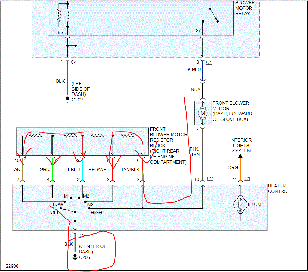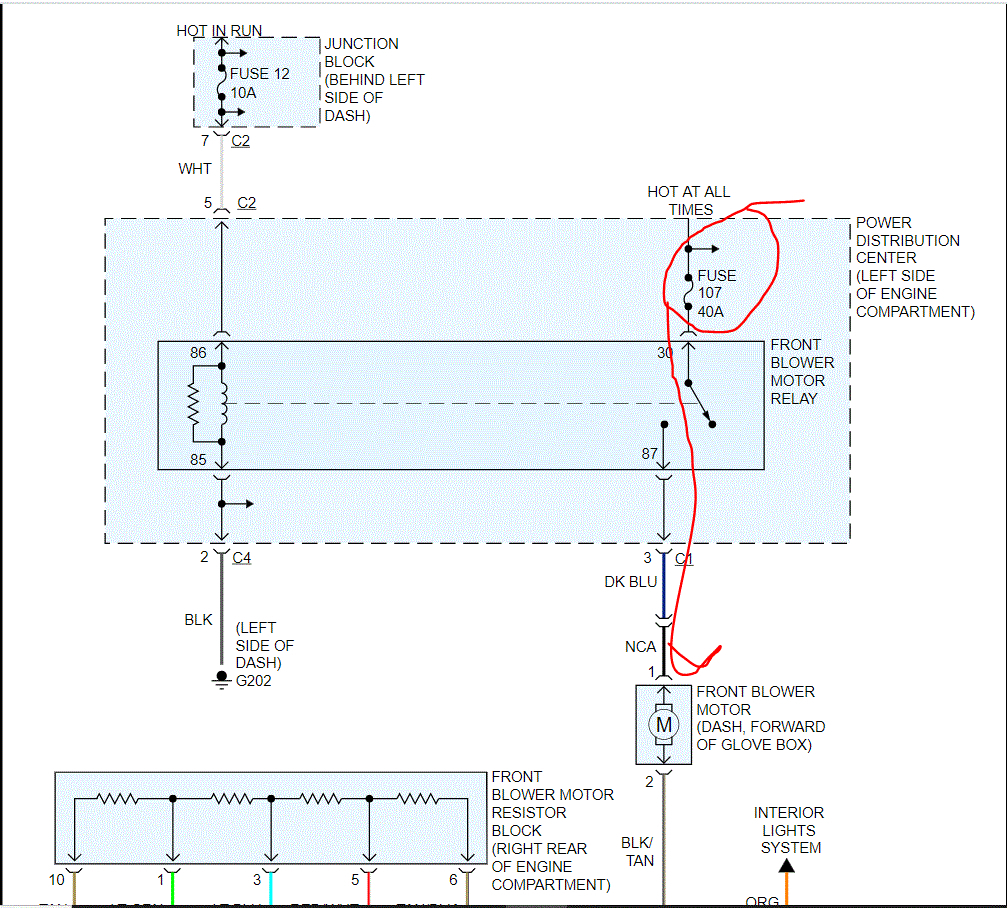 I need to first try to explain how the power runs through this system. Power isn't sent from the switch. Instead, it goes from the fuse (107), to the relay, then to the blower motor, the resister (based on speed requested), and then through the switch to ground. It's the opposite of what most people would expect.