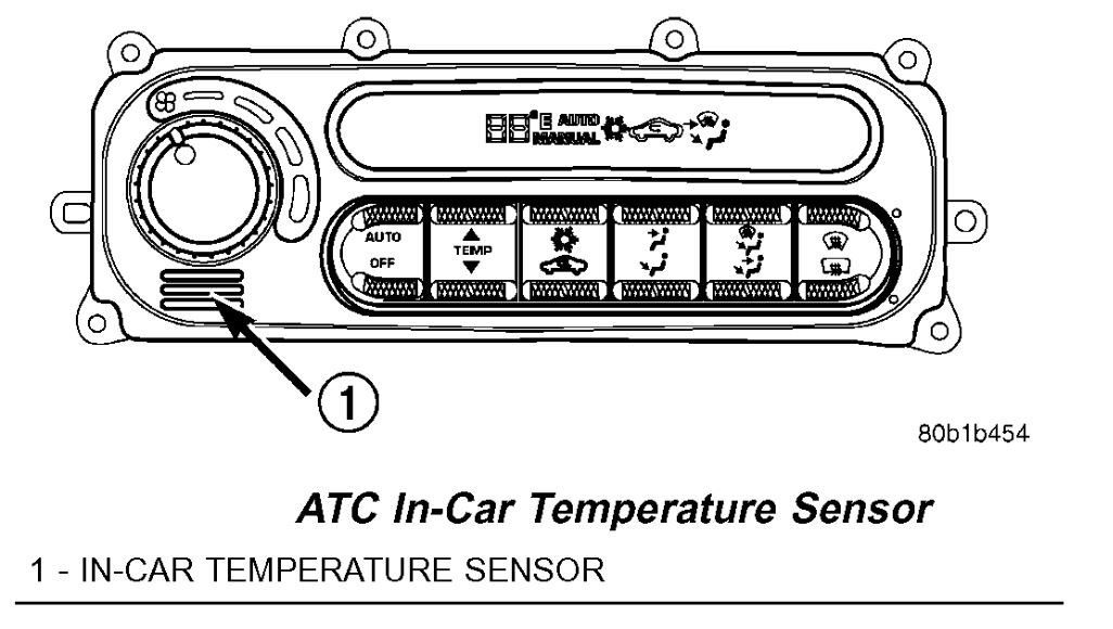 The in-car temperature sensor is used in the automatic temperature control (ATC) heating-A/C system only. The in-car temperature sensor returns electrical signals to the body control module (BCM). The in-car temperature sensor is made up of two parts. One part is the in-car sensor aspirator motor assembly, and the second part is a temperature thermistor. The in-car sensor aspirator motor assembly attaches to the back of the A/C-heater control. This assembly has a small fan and a motor which draws air from the passenger compartment through the intake on the front of the A/C-heater control and past the in-car sensor thermistor which is located inside of the A/C-heater control.